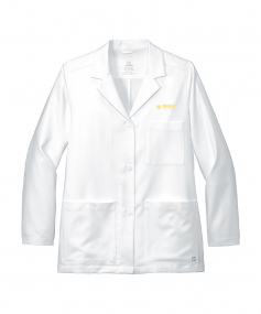 This lab coat is made with 65/35 poly/cotton poplin and features a locker loop, left chest pocket with pen slot, top-loading front pockets, an interior tablet pocket, a back yoke, a 3-button placket opening, center back vent, and the WonderWink® heat transfer logo at left pocket. Medium size is 29.5" back length.